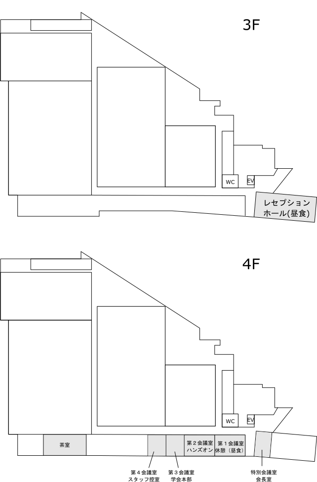 - 講演会場内にWi-Fiはございません。休憩会場(3Fレセプションホール、4F第1会議室)に設置させて頂きますのでそちらでご利用ください。